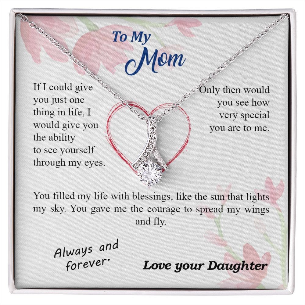 You filled my life with blessings, like the sun that lights my sky. You gave me the courage to spread my wings and fly.Buy now with - Free shipping!Imagine her reaction when she opens this stunning gift! The Alluring Beauty necklace features a petite ribbon shaped pendant that is sure to dazzle your special someone. Whether it's a birthday or anniversary, make sure to get her a gift she will love for years to come. 14k white gold finish or 18k yellow gold finish over stainless steel 7mm cubic zirconia Pendant dimensions: 0.8" (20mm) height / 0.4" (10mm) widthAdjustable length: 18" - 22" (45.72 cm - 55.88 cm)Lobster claspYour piece is lovingly packaged in a complimentary soft touch box for easy gifting. Elevate your presentation by upgrading to the mahogany style luxury box, which features a brilliant LED spotlight.